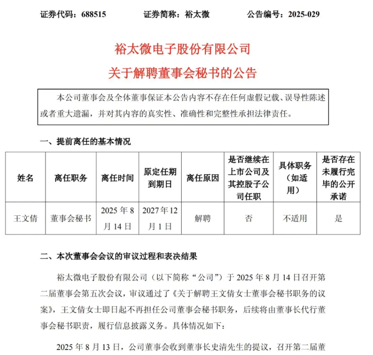 8月16日,裕太微(688515)发布公告称8月14日董事会以5票本旨、2票反对,强行解聘王文倩董事会书记职务。